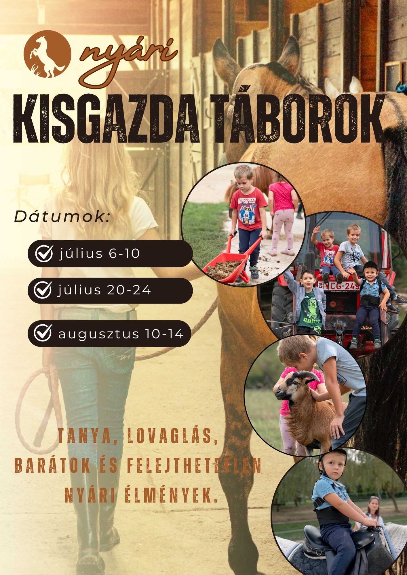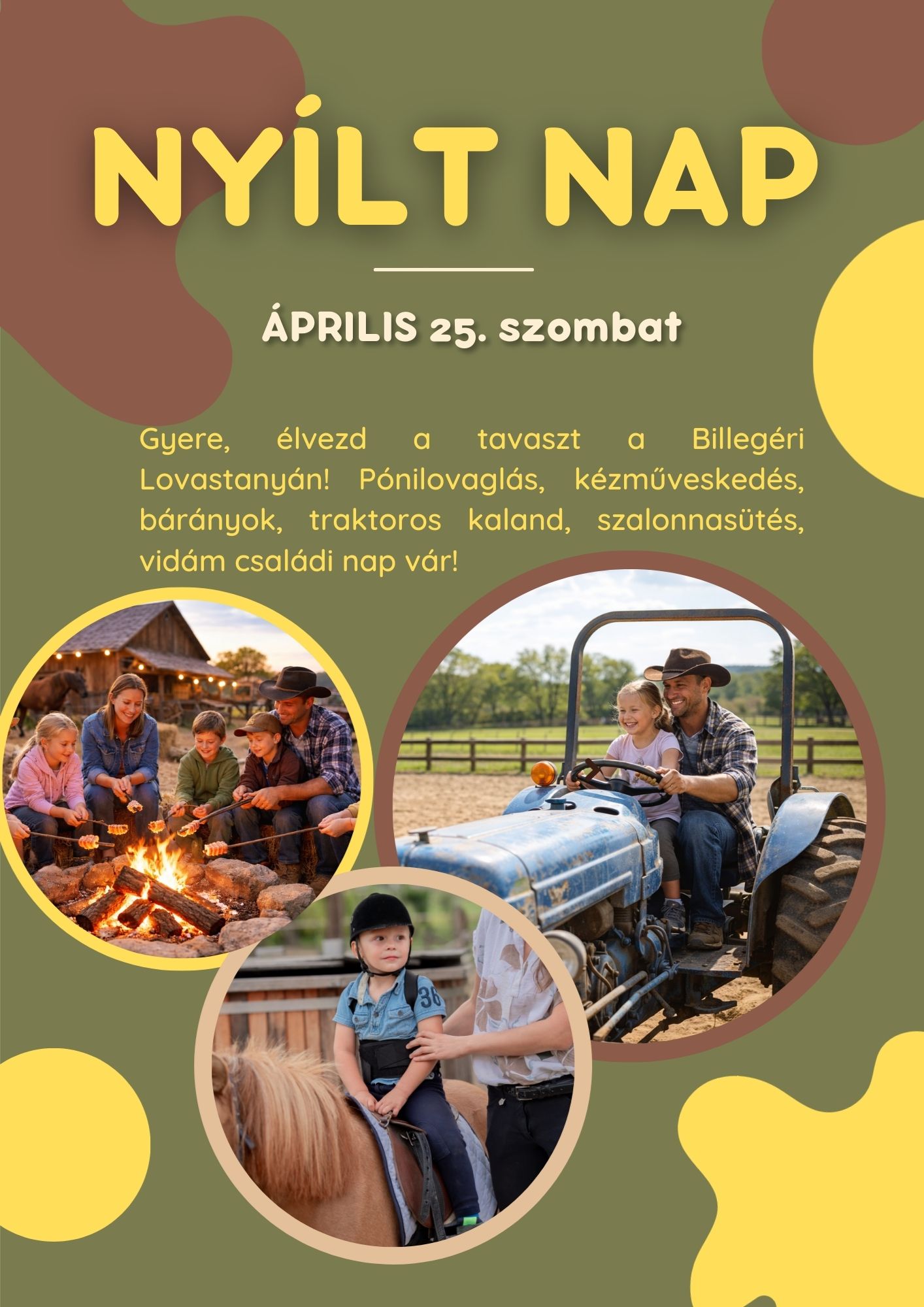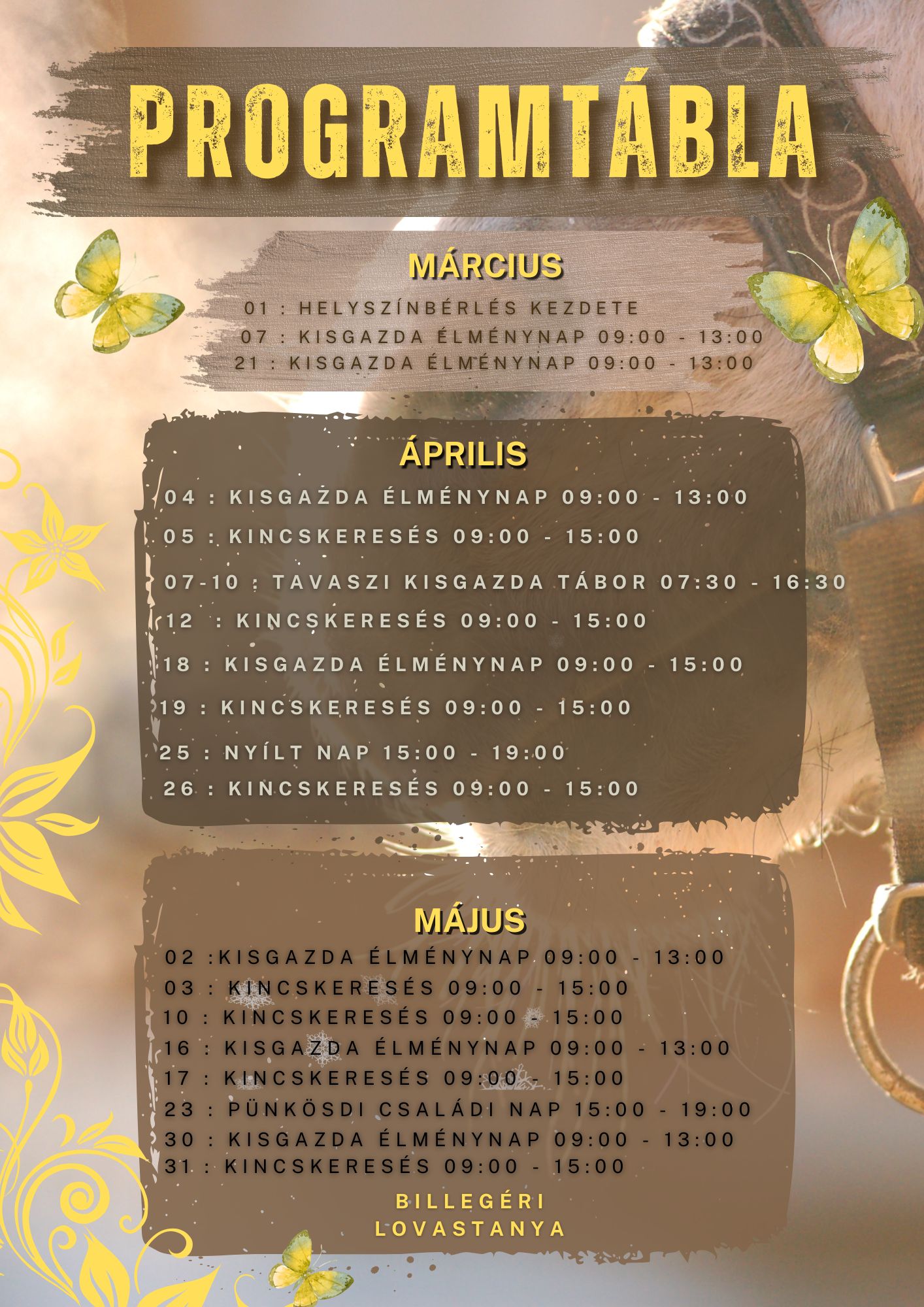 A Billegéri Kisgazda Émlénynapok egy különleges, kéthetente megrendezésre kerülő, 4 órás hétvégi program, amelyet kifejezetten a 3–18 éves korosztálynak álmodtunk meg. Minden második szombaton , 9 és 13 óra között várjuk a gyerekeket a Billegéri Lovastanyán – ott, ahol a szabadság, a természet közelsége és az állatok szeretete varázslatos élménnyé áll össze.
